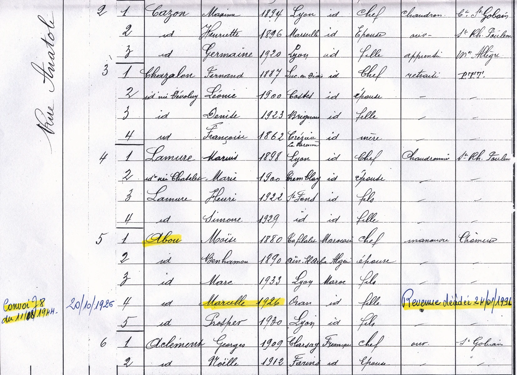 Dernière adresse connue : 12 (ou 5), rue Anatole France (Saint-Fons)