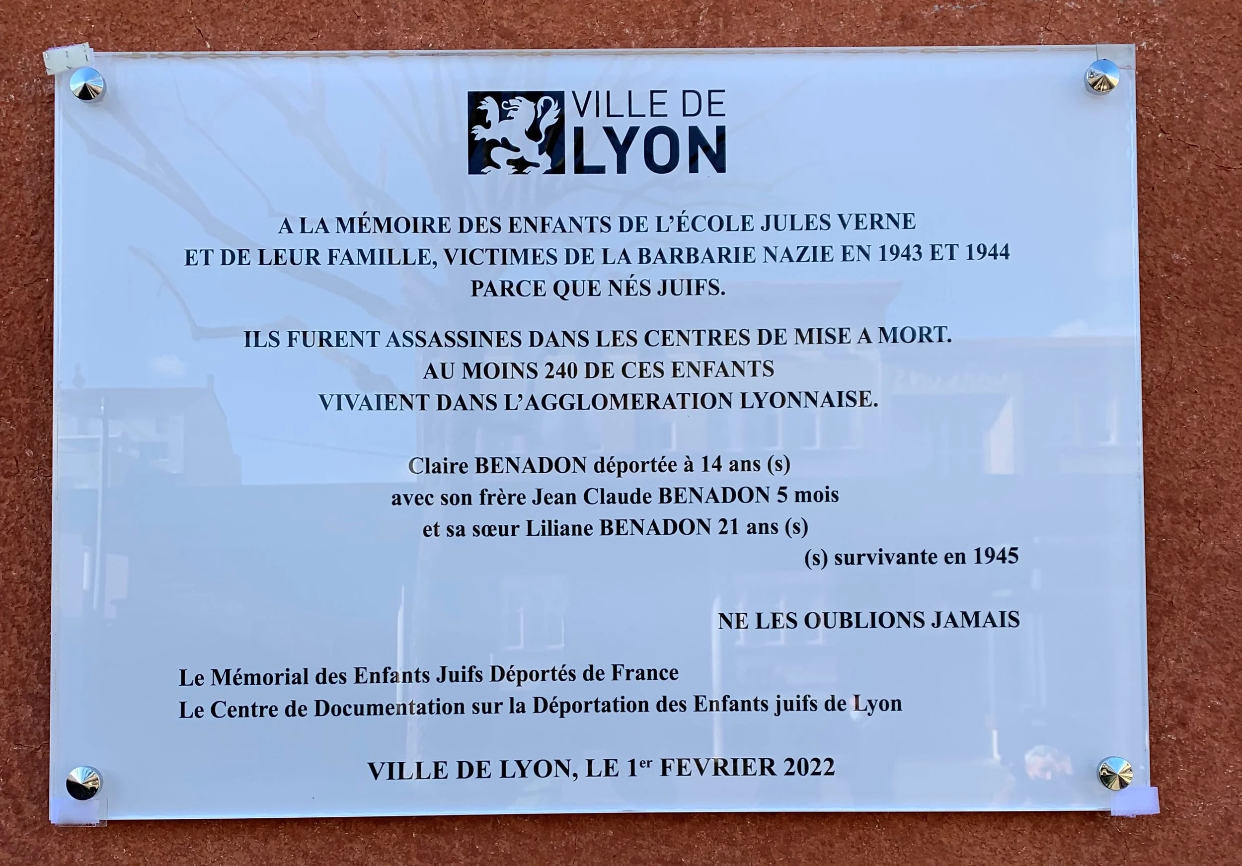 Benadon (Jean, Claude), né le 27 décembre 1943 à Lyon (Rhône), décédé le 4 juin 1944 à Auschwitz (Pologne). Benadon, née Mallah (Palomba dit Paulette), le 13 juin 1904 à Salonique (Grèce), décédée le 4 juin 1944 à Auschwitz (Pologne).