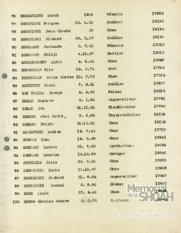 Bentitou (Baruk, Raoul) né le 7 mai 1931 à Palikao-Oran (Algérie) décédé le 18 avril 1944 à Auschwitz (Pologne). JO