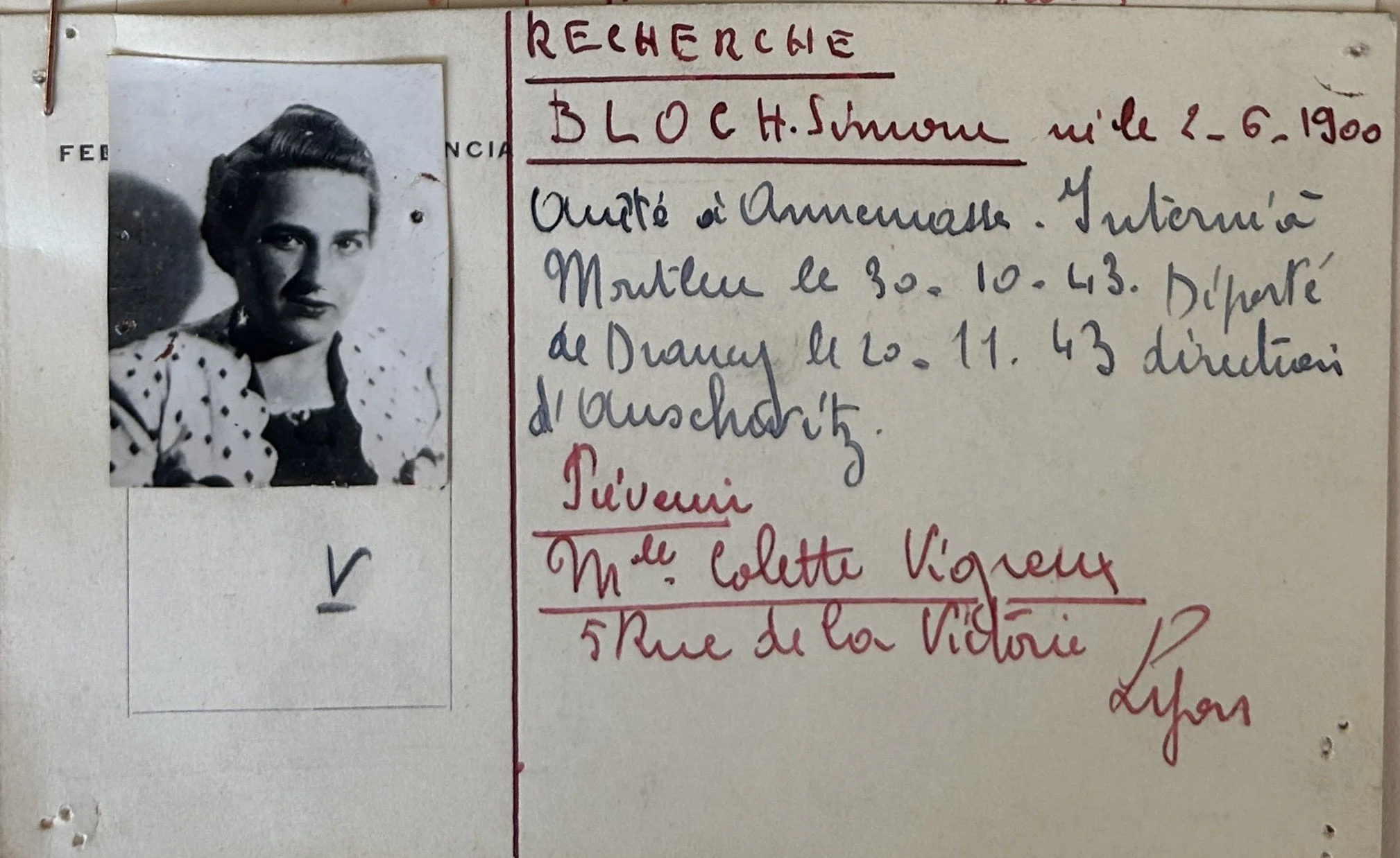 Informations diverses : Liliane est la fille de David Bloch (07/05/1888) et de Simone Bloch née Scheuer (02/06/1900, Chalons). Elle était scolarisée au Lycée Edouard Herriot, 6ème (21/04/41-31/3/1942; raison "disciplinaire"; parents antiquaires. Refoulés à la frontière suisse, Perly-Certoux (Suisse) Saint-Julien-en-Genevois, ils sont arrêtés à Annemasse, ils seront internés à la prison Montluc à Lyon.