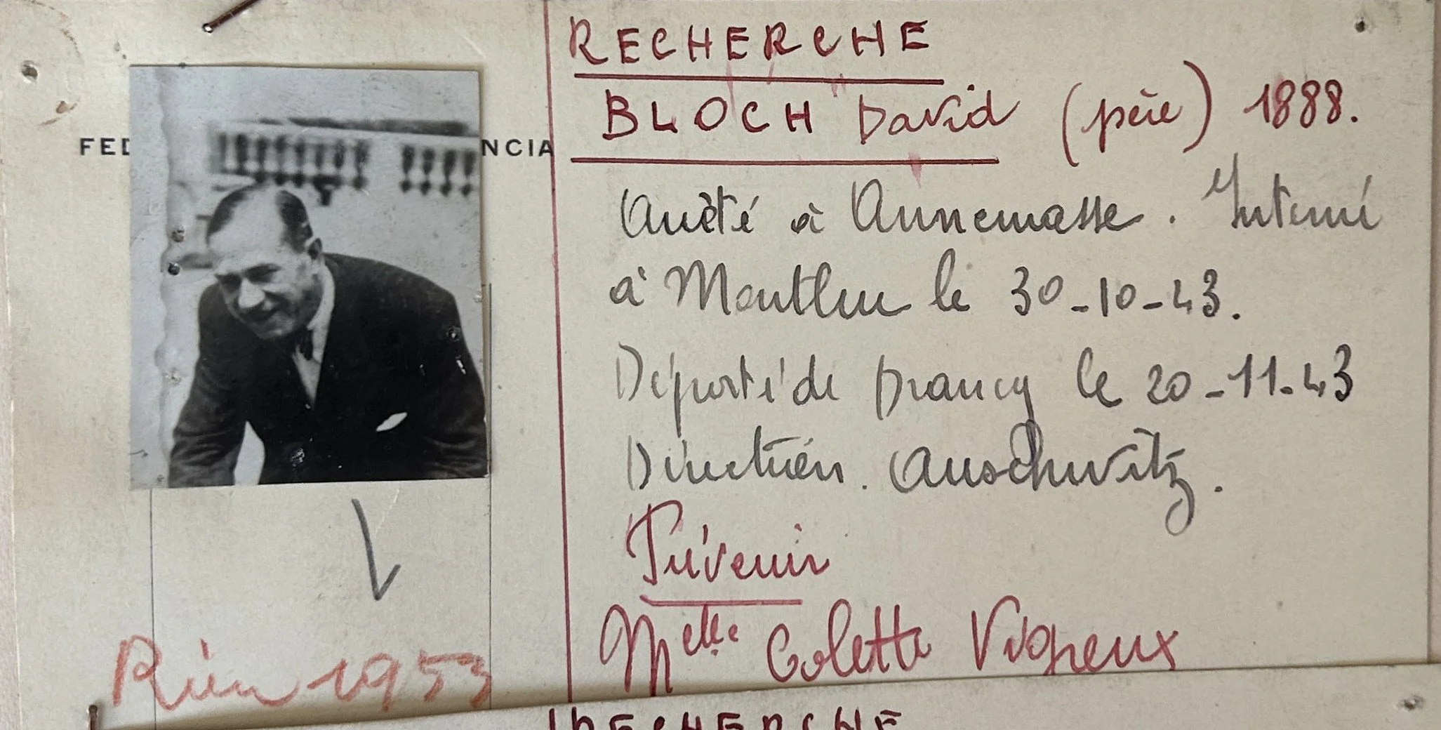 Informations diverses : Jacques Bloch est né le 17/08/1926 à Strasbourg. Il est le fils de David Bloch (07/05/1888, Strasbourg) marchand épicier et de Simone Bloch née Scheuer (02/06/1900, Châlons-en-Champagne) et le frère de Liliane. Il était scolarisé au Lycée du Parc, 6ème (entrée 29/3/1941). Menuisier. Refoulés à la frontière suisse, Perly-Certoux (Suisse) - Saint-Julien-en-Genevois, rassemblé à Annemasse, ils seront internés à la prison Montluc à Lyon. Jacques, Liliane et leurs parents seront déportés à Auschwitz par le convoi n°62 du 20/11/1943.