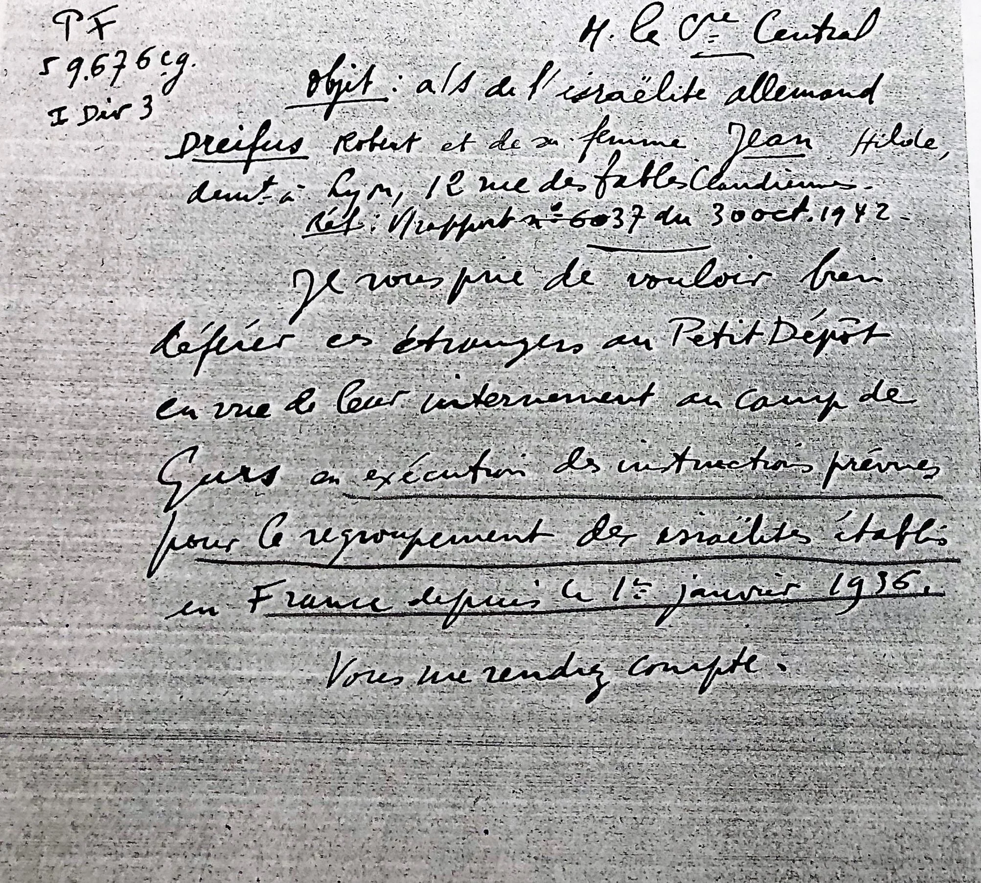 Informations diverses : Fille de Robert (08/02/1900, Pirmasens, Allemagne), dentiste et de Hilde Margarete (née Jean le 26/05/1907, Deux-Ponts ou Zweibrücken, Allemagne), tailleur, qui se sont mariés le 20 décembre 1928 sans doute à Deux-Ponts (à 2 km de la frontière française près de la ville de Bitche, Moselle). Lore dite Nani nait le 20/05/1931 à Deux-Ponts. Le 10-12/11/1938, son père Robert est arrêté et déporté à Dachau du 12/11/1938 au 30/01/1939 avec son frère Arthur et un groupe de Juif. Ils seront expulsés de l’autre côté de la frontière, en France (Source: Karola Streppel, Groupe de travail sur l'histoire des juifs de Pirmasens). Il rentre en France le 27/02/1939 par Forbach. Il est interné au camp de Chambaran (Isère) où il est employé (en temps que dentiste) comme d’autres allemands à des travaux militaires en tant que « prestataires ». Hilde et Lore entrent en France le 29/03/1939 (?) par Forbach avec comme motif leur départ en Uruguay. Elles réside à Paris 18ème , rue de Chartre, Hôtel du Commence jusqu’au 28/04/1939, puis sont venue à Lyon où elle habitent, 12 rue des Tables Claudiennes (Source: Préfecture du Rhône, 02/01/1940). Elles obtiennent un permis de séjour expirant le 31/07/1940. Thekla Stern (née Dreifus) est la soeur de Robert Dreifus et Laure est la cousine germaine de Peter Stern, déporté par le convoi 66.