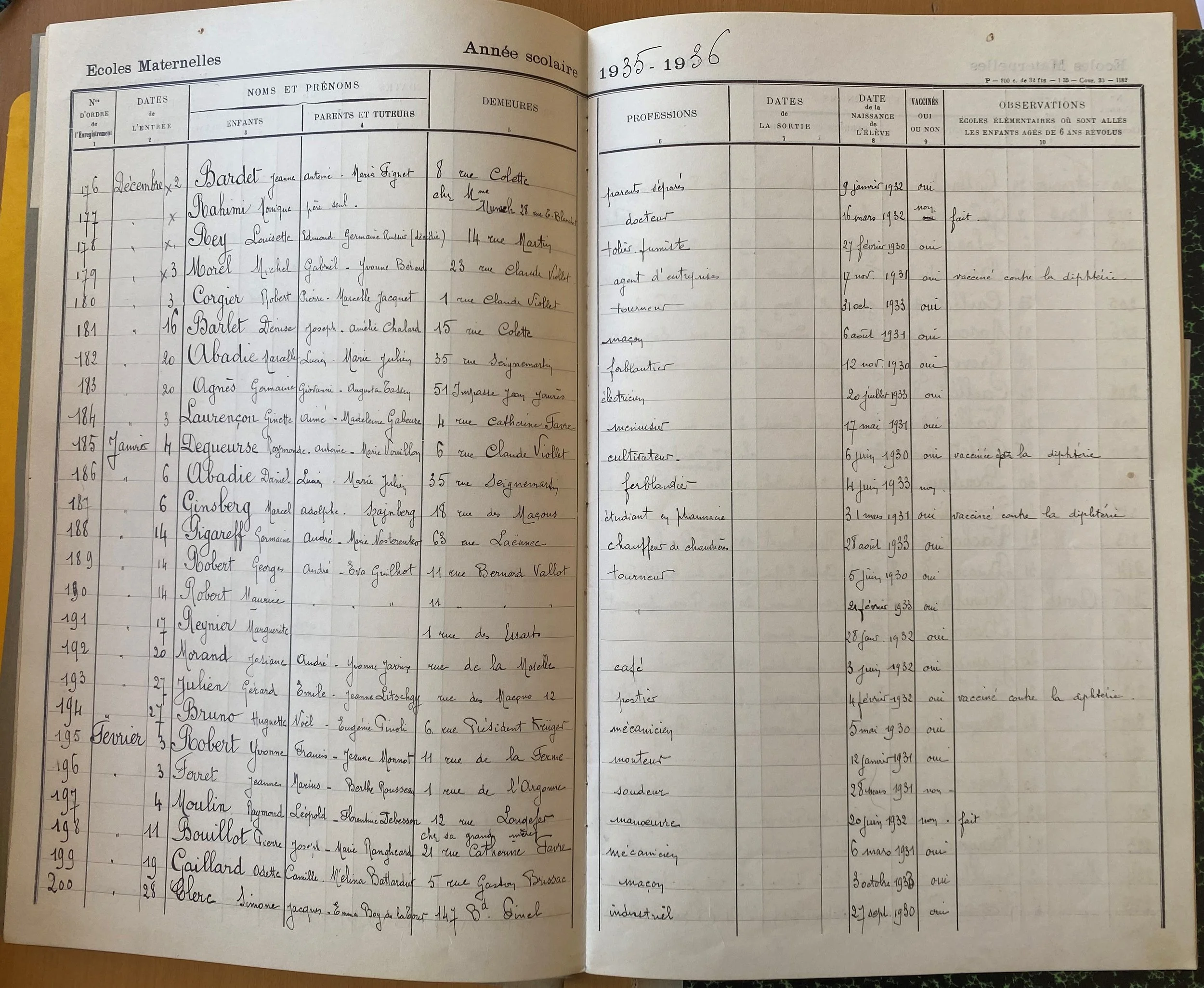 Informations diverses : Marcel est le fils de Adolphe Ginsberg (25/08/1900, Lodz, Pologne), étudiant en pharmacie ( assistant pharmacien) et de Bajla, Ruchla née Szajnberg (14/10/1904, Lodz, Pologne), hôtelière-restauratrice. Marcel est né à La Tronche dans l’Isère. Ils vivaient en 1936 à Lyon au 18 rue des Maçons (69008). Marcel était scolarisé à 4 ans à l’Ecole Edouard Herriot dans le 8ème arrondissement (entré le 06/01/1935). La famille déménage au 135, Grande Rue de Montplaisir (aujourd’hui Avenue des Frères Lumière). Marcel est caché à la Maison du Refuge (77, rue de la Villette 69003 Lyon) du 08/02/1944 au 02/03/1944 (Source: APAFFIDA, Association des parents et amis des familles françaises israélites déportées en Allemagne). Il est arrêté et déporté à Auschwitz avec son père Adolphe et sa mère Bajla, par le convoi 69 du 07/03/1944. Ils sont tous les trois morts à Auschwitz.