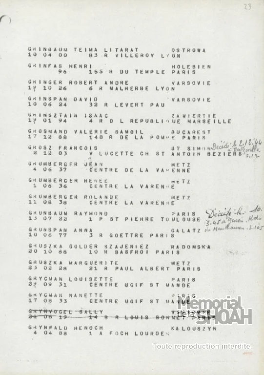 Informations diverses : Né à Wołomin (Masovia, Pologne) le 19/10/1925 (Source : Service historique de la Défense, Caen, Cote AC 21 P 458 766). Robert Gringer habitait au 6 rue Malherbe à Lyon d’après la fiche de Drancy. Cependant au 6 rue Malherbe à Villeurbanne, vivait pendant l’occupation Léon Meïss, fondateur du CRIF. Le 6 rue Malherbe est aujourd’hui le siège de la synagogue de la Fraternité. Il est donc possible que Robert Gringer est habité à cette adresse. Déporté seul.