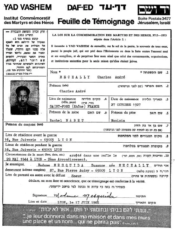Fils de Hanania MECHALLY né en 1893 à Tanger et de Rachel NABET né en 1898 à Constantine. Déporté seul au camp de concentration allemand de Flossenburg. Déclaré officiellement "mort en déportation" au JO n°67 du 19/3/1995.