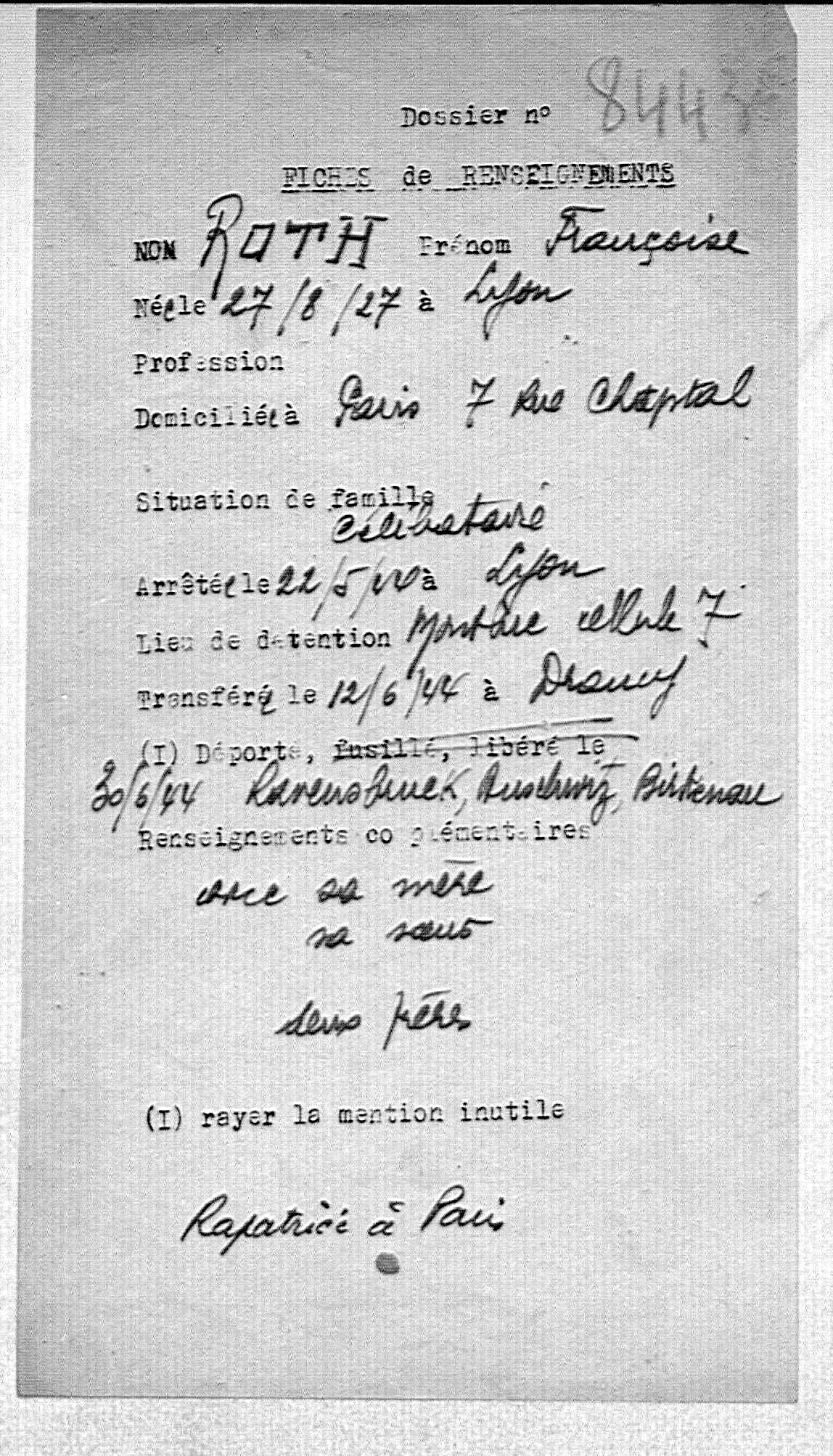 Renseignements sur la présence de Françoise au Lycée, son arrestation et sa déportation à Auschwitz le 30 juin 1944 par le convoi 76. Déportée avec ses frères jumeaux André (26/08/1924, Lyon) et Paul (26/08/1924) ainsi que leur mère ? Laure (18/11/1887, Fegersheim).